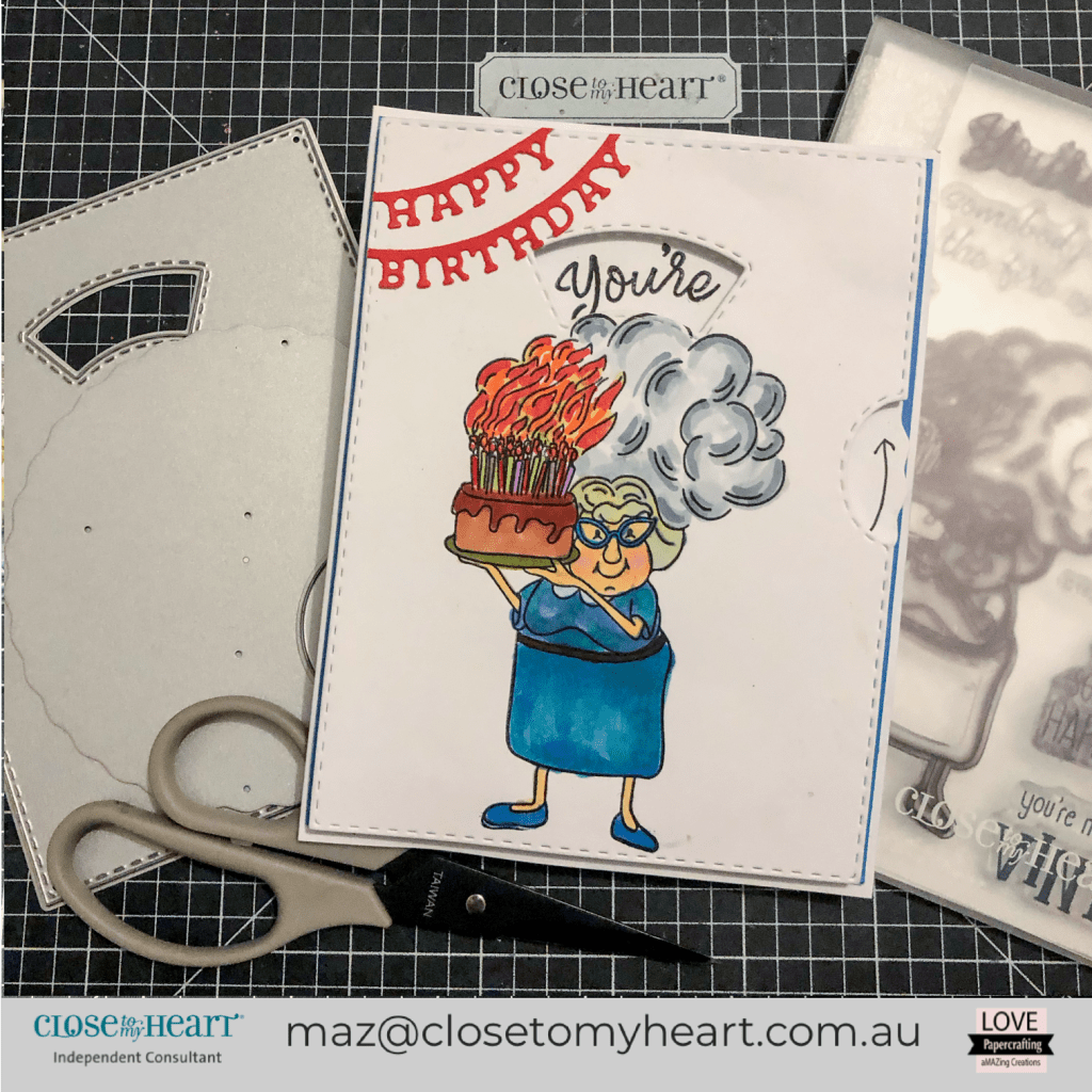 The first card I had to use the You’re Not Old stamp set with the new Card Front Spinner Thin Cuts to reveal the cheeky message of “You’re How Old?”