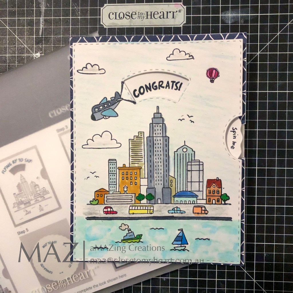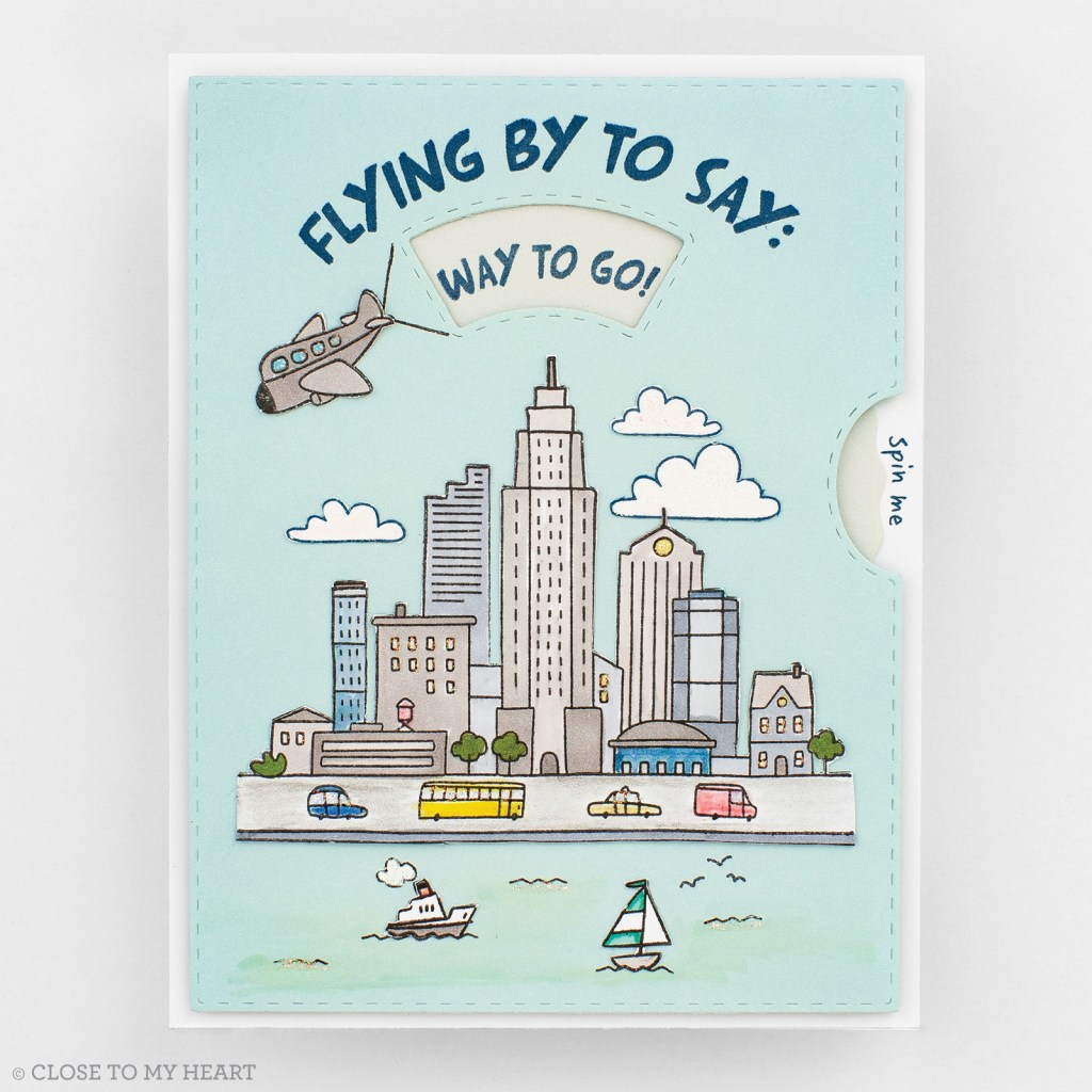 My next idea is using the Fly-by Greetings this is one of the sets that has been specially designed for the Card Front Spinner Thin Cuts Die. I just love how the plane looks like it is pulling a banner across the sky.