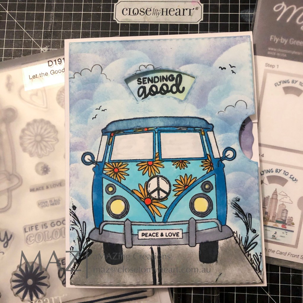 When I first saw the VW Van in the Let the Good Times Roll stamp, I thought this is perfect to use with the Card Front Spinner Thin Cuts Die. This is such a fun card,