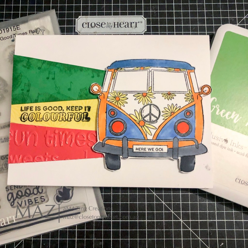 On the green cardstock I stamped on the lighter side & edged with ink. On the yellow I did stamp onto it, but it was harder to tell. And on the red I embossed the cardstock with the Celebrate Embossing Folder as I noticed it had Fun Times & I wanted that to appear with the Van.