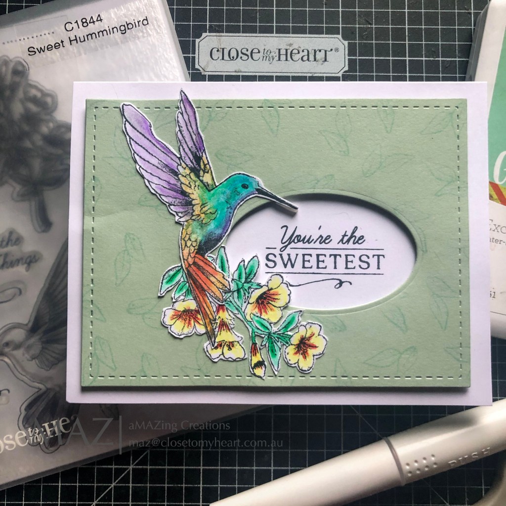 I cut the stitched rectangle first, then placed my oval where I wanted it & cut that. I stamped over the card stock with the small leaf in the background. I stamped the saying directly onto the card & added foam tape to raise the background. I then stamped, coloured & fussy cut out the bird & flowers in watercolour pencils & added some shimmer with the shimmer brush.