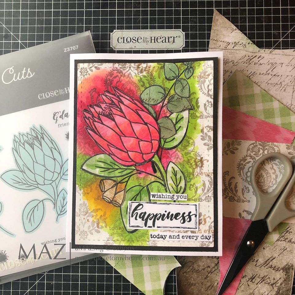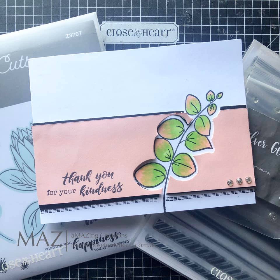 I stamped the arrangement of the flowers & leaves from the Blossoming Friendship Stamp + Thin Cuts onto the Yesterday & Today paper & coloured it with makers, blending out. I then re-stamped the flower onto the Pink pattern & Green & White Check from the These are My People Paper and the gum nuts & gum leaves onto Yesterday & Today’s papers.
