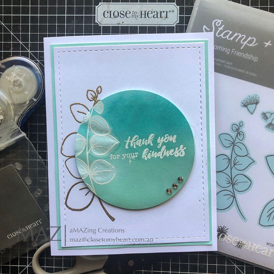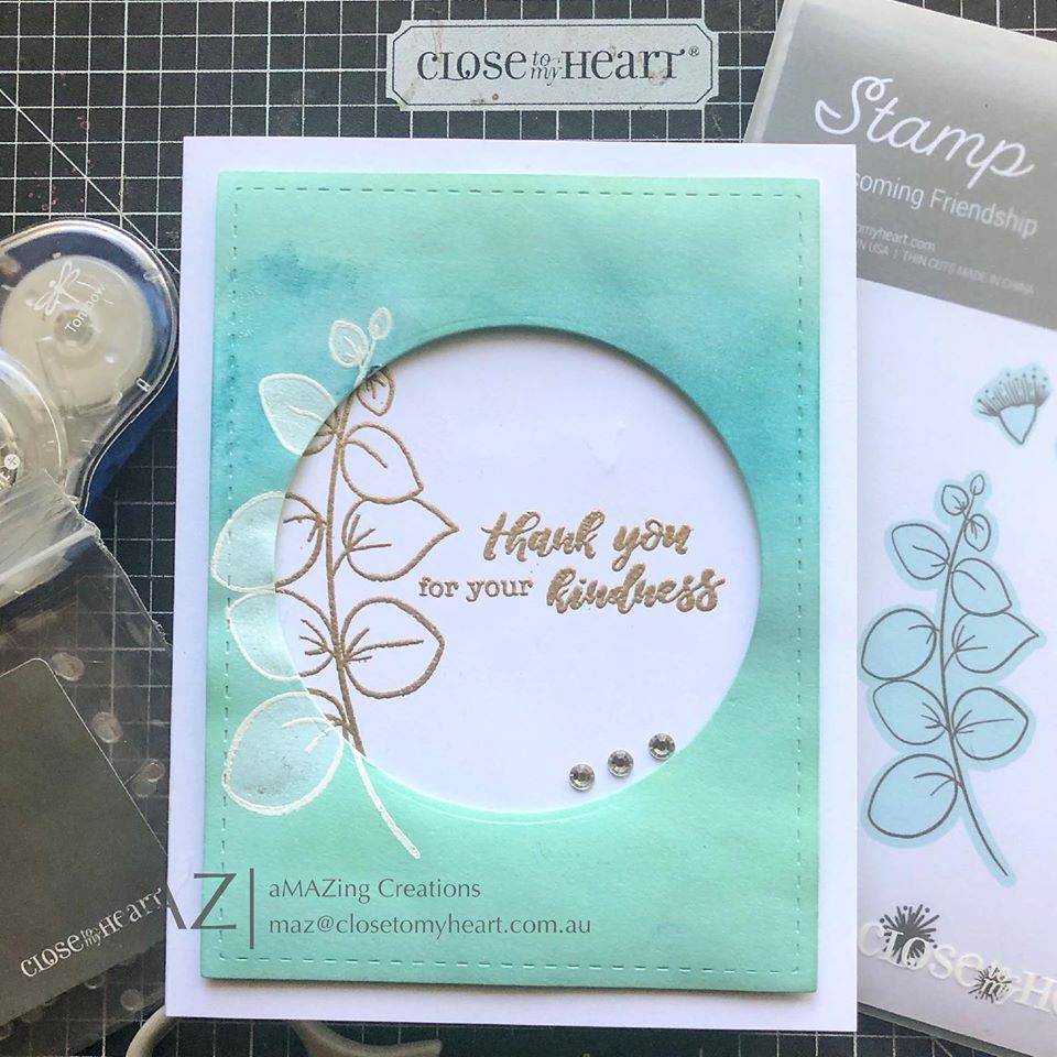I cut out the the white daisy cardstock with the Stitched Rectangle Frames Thin Cuts & then I worked out the position of the image & stamped the same leaf from the Blossoming Friendship Stamp + Thin Cuts & embossed in Princess Gold Embossing Powder. The circle was also cut out on this card too