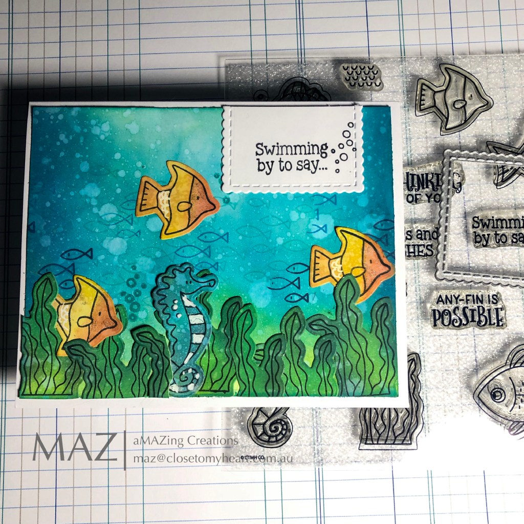 I created a fun ocean background with Mermaid Lagoon & Chipped Sapphire for the ocean & blended some Mowed Lawn Distress at the bottom where I was going to place the seaweed. I sprayed with water & once dried I stamped some little fish in an assortment of inks. I coloured some cardstock with Mowed Lawn Distress & added some touches of left over blue distressed oxide inks & sprayed with water. I created seaweed with this. For the Angel Fish I done some Mustard Seed, Spiced Marmalade & Abandoned Coral. I added touches of white gel pen to the tails.