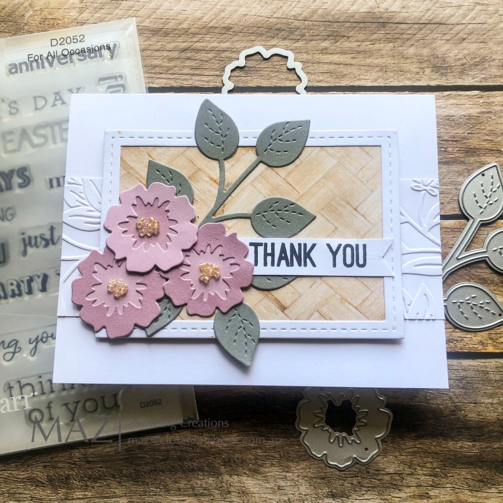 I cut out some Mulberry Cardstock flowers & Rosemary Cardstock leaves with the Layered Flowers Thin Cuts for some added depth & a Thank you stamped from the For All Occasions stamp set. I finished off the flowers with some Bright Bitty Beads.