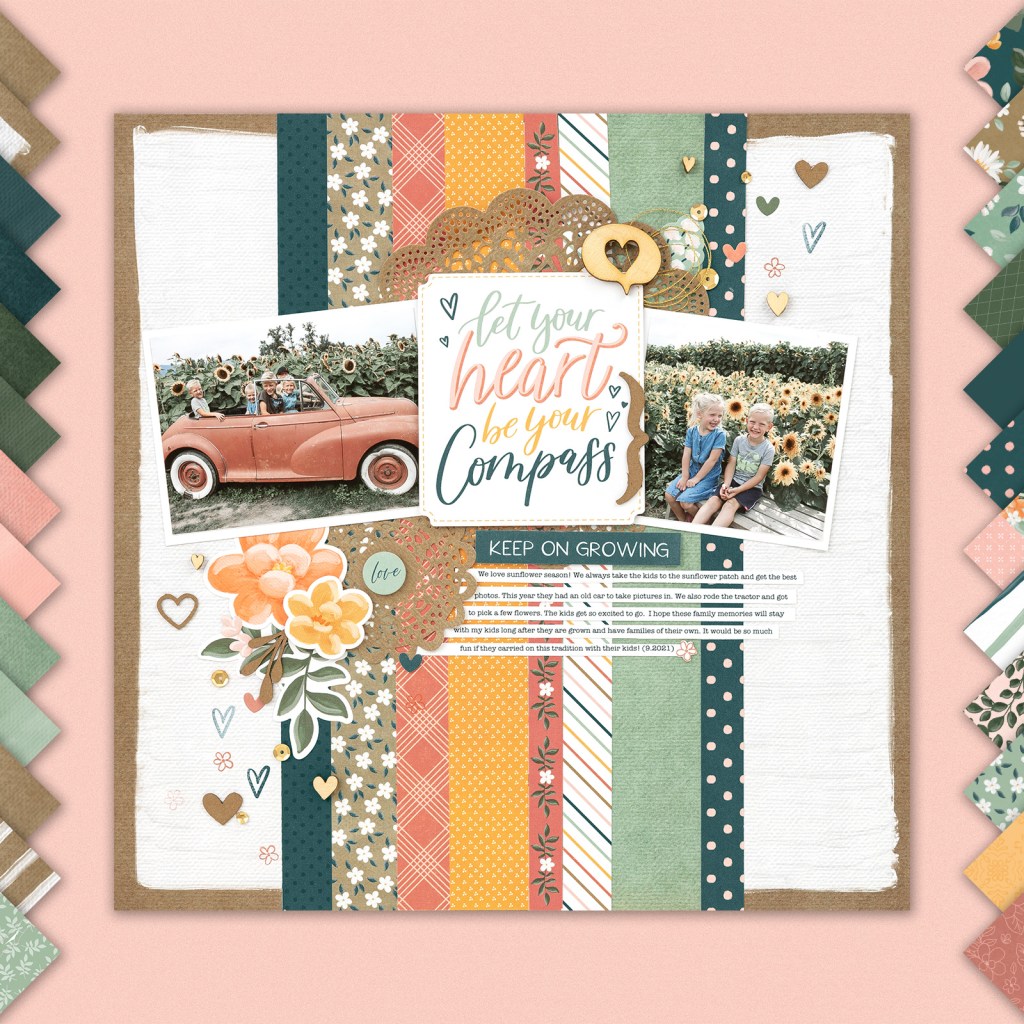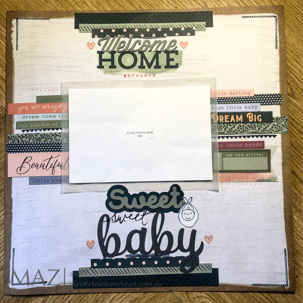 The next layout I mixed the Hope & Kindness collection with the As You Grow Paper Collection to create this Welcome Home Baby Scrapbook layout.