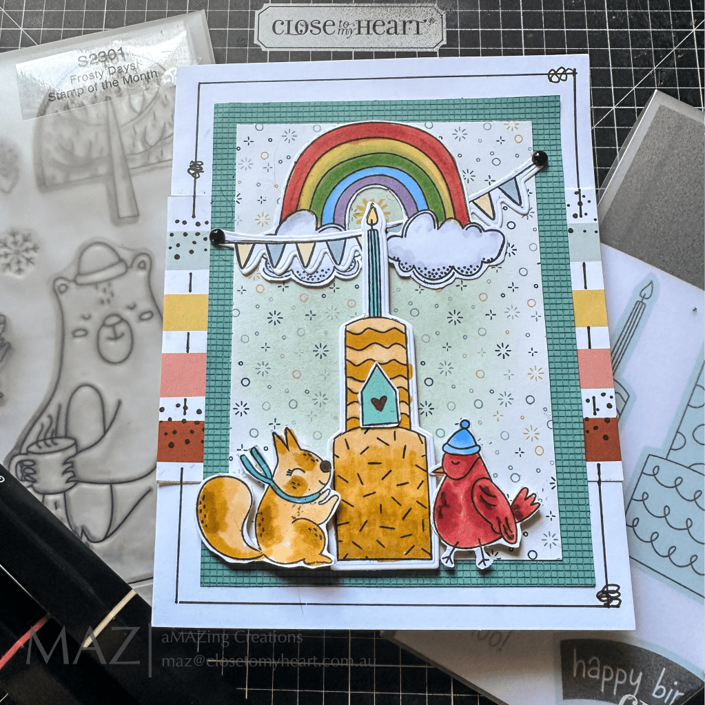 I used the Celebrating You Paper Packet as that paper collection is perfect for Birthdays. I did some sponging in the middle to create some depth. I also added a rainbow from the Storybook—Scrapbooking Stamp + Thin Cuts as I felt it needed it as I was not using the base cake to make it as tall. A couple of Forrest Critters from the Frosty Days—January Stamp of the Month & a little birdhouse decoration on the cake finished the card up nicely.