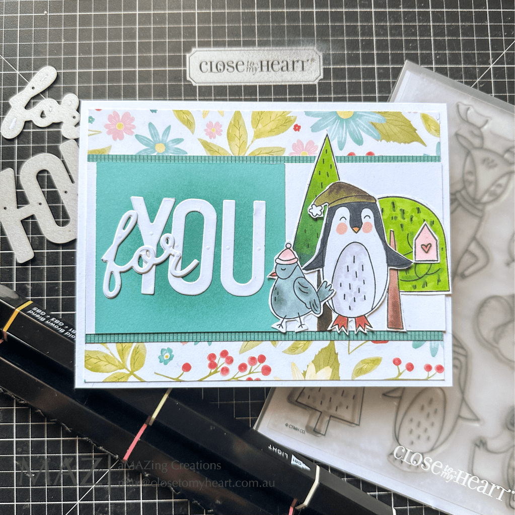 A sentiment can change what the card is intended for. You can use Thin Cut Dies, Cricut or Digital Images or stamps to choose a sentiment for any occasion & is a very simple way to change these Frosty Days critters from Winter Christmas feel to something more summery. The critters that I used have beanies, but they sort of give them a Hipster Look (Though I don’t think the Hipster Look is still a thing these days LOL), but the card is now a For You Card by using this Thin Cut Die on the card.