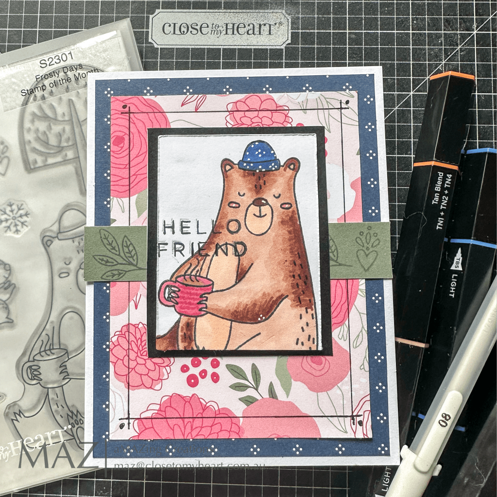 I decided that I wanted to see more of the pattern paper that I used on this card so I did cut down the bear image I stamped. It is perfectly ok to not use the full image. I coloured the bear with both the Tan TriBlend™ Marker & the Tan Shades TriBlend™ Marker to give some highlights & shadows & added a couple of white gel highlights. The mug was coloured to match the floral paper from the the Flower Shoppe Paper Packet. I over stamped the Hello Friend image onto the bear – it just seemed perfect sentiment as he is holding a cup of coffee which you have with a friend.