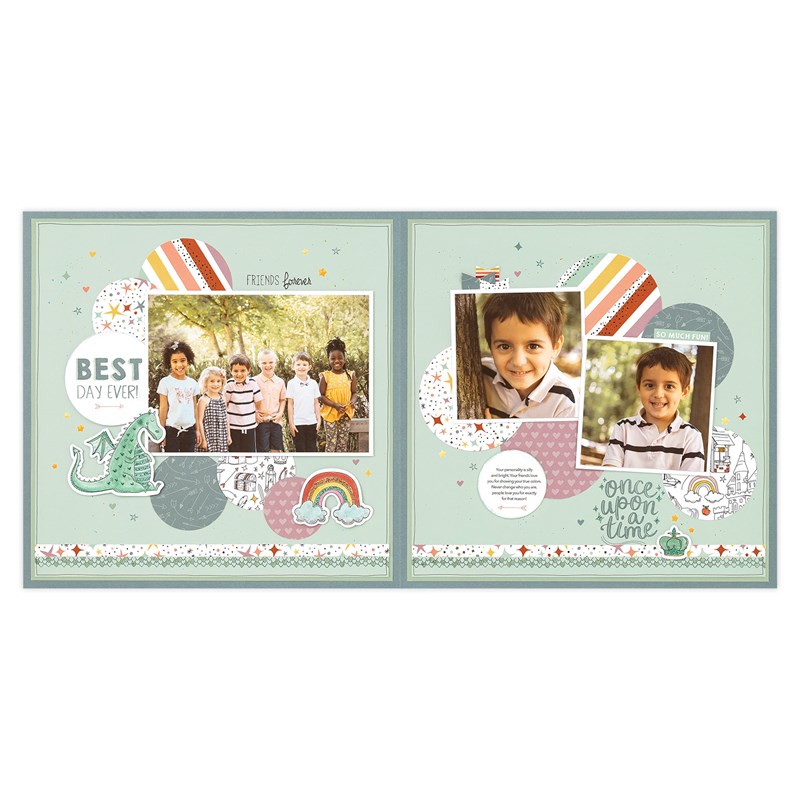 I stamped the Dragon with Versamark Watermark Stamp Pad & used Princess Gold Embossing Powder ( I mean with Princess in the product name – what else would you use LOL) & as I did not get the matching Thin Cut dies, I fussy cut the dragon out, but you could totally use the Storybook—Scrapbooking Stamp + Thin Cuts. I created a magical background using Villainous Potion Distress Oxide Ink and some spritz of Gilt Gloss Spray & Balmy Night Shimmer Spray over a die cut background from the Storybook—Cardmaking Stamp + Thin Cuts – I really liked the dotted swirls & stars that seemed to make this background even more magical.
