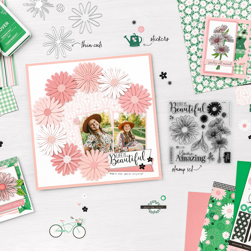 White Daisy Cardstock & added a Harbour Cardstock matt behind the embossed & stenciled background.