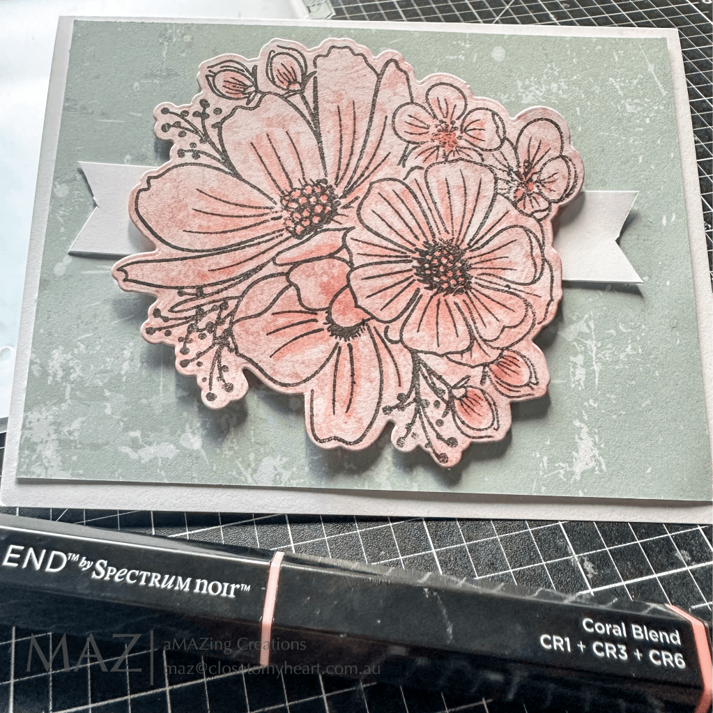 I stamped the Bouquet Stamp + Thin Cuts onto Papaya distressed fleur de lis pattern paper & just added a little extra colour with the Coral TriBlend™ Marker which worked perfectly with the pattern paper. The Bouquet was cut out & added onto of a white daisy piece over a background created from the Seabrook distressed pattern paper to complete the card.