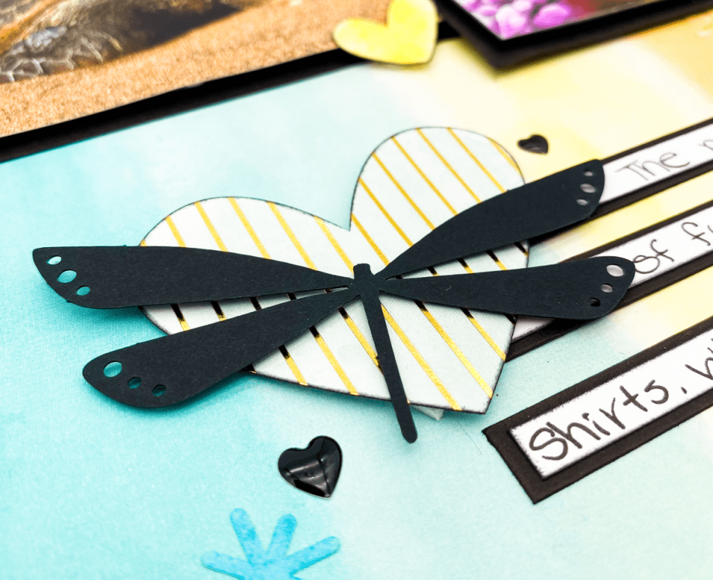 The chic flowers along the top of the photos were also attached with foam tape. They were stamped using the Dream Maker stamp set, hand trimmed, and then curled to create a beautiful, dimensional, more life-like effect. It is so easy to do