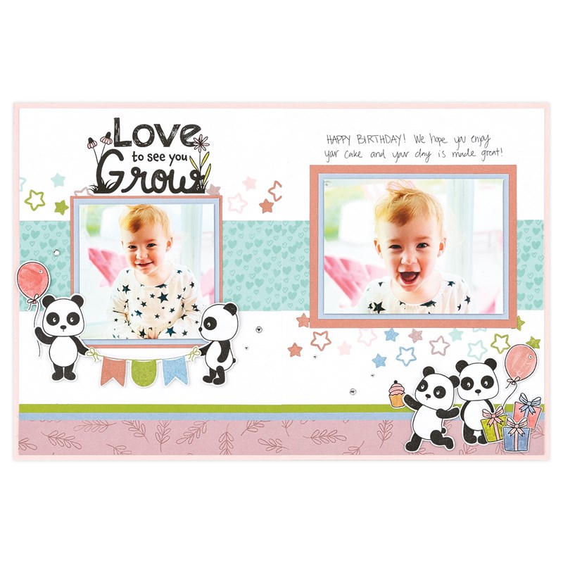 Gather your photographs and let your creativity run wild (and super cute with the Cute Pandas Stamp Set) on a 6″ x 8″ scrapbooking layout. The smaller size encourages creativity and experimentation with layering, patterns, and textures and can be easily incorporated into the 6″ x 8″ Everyday Life™ Album On this Love to see you Grow the stamps have been used to create pattern paper on the Scrapbook Layout.