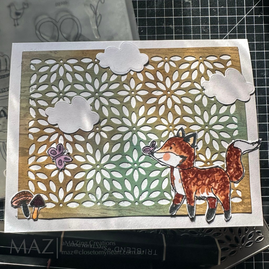 I then stamped out the fox’s & did some rough colour in to try & give texture to the fur, it is very different to how I would normally use the TriBlend Markers, but this was another thing on my list to try out.