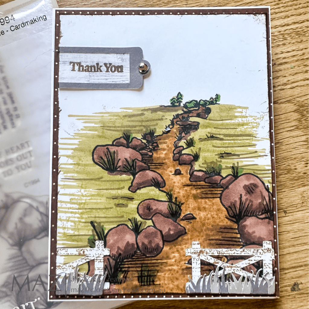 I thought I change the river into a dirt path with a gate/fence entry. I stamped the image on to cardstock & masked off the rocks to add some texture onto the path with the Design Elements Stamp Set. I coloured in the image with Tri-blend markers & added the fence & grass from The Good Life Digital Collection cut out from some the papers using the cricut. I added some of the pattern paper as matt & attached to the card. I did add a little more texture to the grass after I put it all together with the Design Elements Stamp Set.
