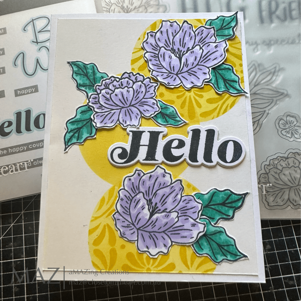 I coloured in the flowers & leaves with the Tri-blend markers & arranged them onto the card with the Hello sentiment.