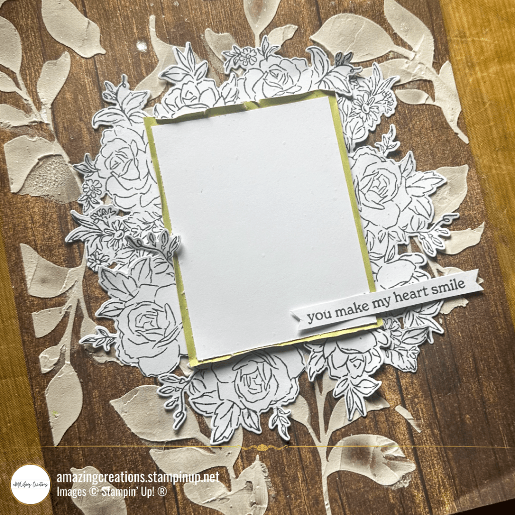 This beautiful layout captures a feeling of rustic elegance. This beautiful 8½” x 11″ scrapbook layout uses a woodgrain background (similar to the Country Woods DPS) with a leaf stencil overlaid with texture paste which is very similar to Embossing Paste. The stamped image from the Stampin’ Up Layers of Beauty set has been die cut and fussy cut to create a dimensional floral arrangement. The sentiment “You make my heart smile” completes the layout.
