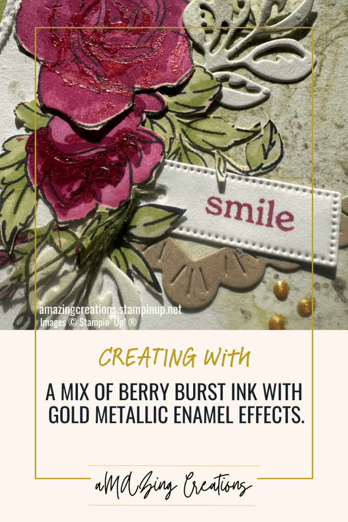 The mix of the Berry Burst and Gold Metallic Enamel Effects was added to the final stencil mask to create some shimmer & texture on the roses. The roses were fussy cut out and attached to the scalloped diamond frame over the watercolour background.