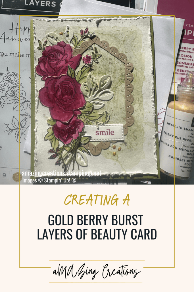 A touch of gold makes all the difference. This handmade card features Stampin’ Up Layers of Beauty coloured with a unique mix of the Berry Burst Ink and Gold Metallic Enamel Effects.