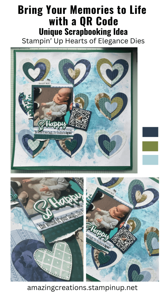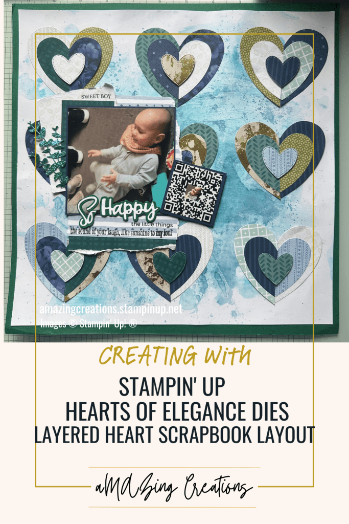 Dive into a world of nostalgia with this interactive scrapbook layout. A stunning blend of watercolor, layered Hearts of Elegance Dies, and a touch of technology. Discover how to add a QR code to your layout for an immersive experience.