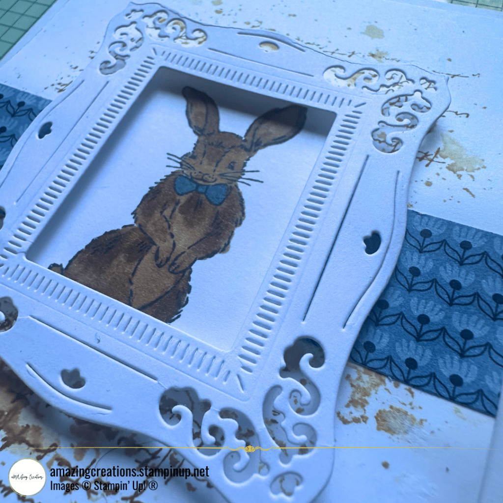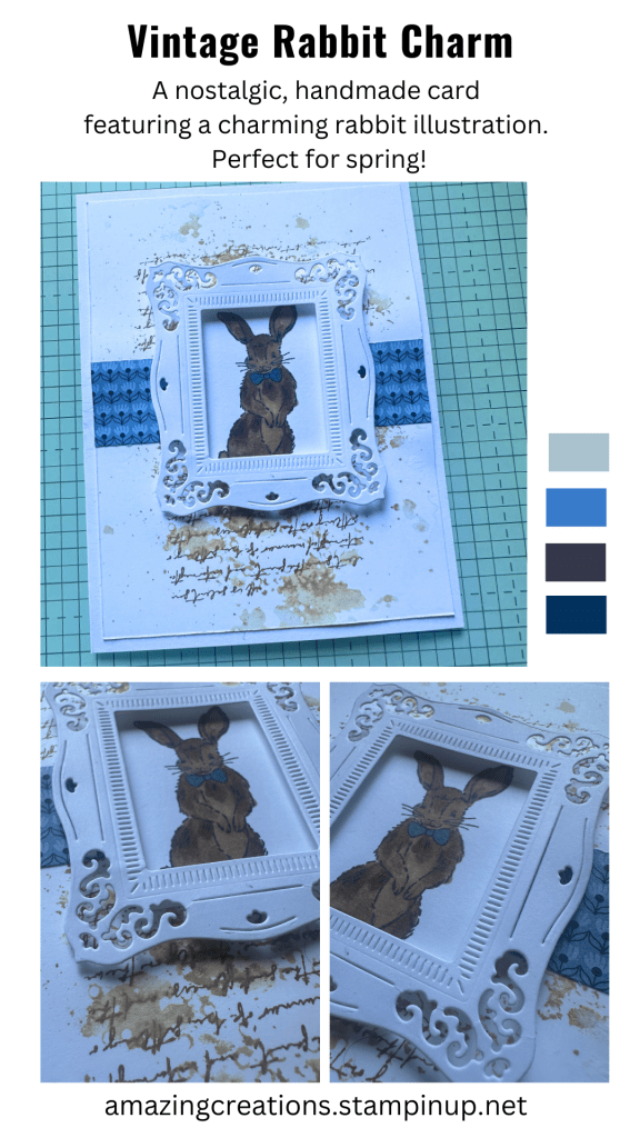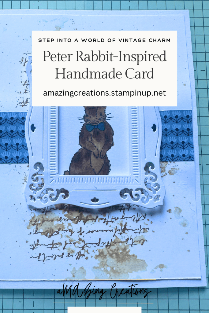 The rabbit which reminded me of the Peter Rabbit Illustrations was coloured in Stampin’ Up Blends helped pull together this whimsical handmade card with a vintage feel. Perfect for a springtime greeting.