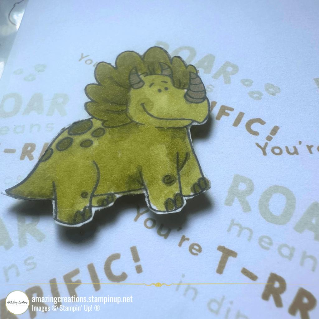The adorable Triceratops from the Stampin’ Up! Darling Dinos stamp set has been coloured with Stampin’ Blends and popped up for extra dimension. The background is filled with a fun dinosaur-themed sentiments, adding a playful touch.