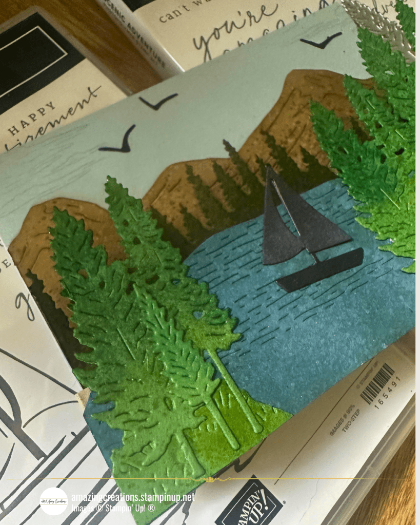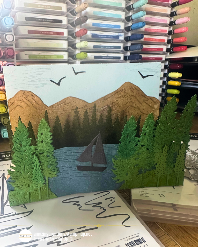 Step into nature with this peaceful 3D scene crafted using the Scenic Adventure Bundle from Stampin’ Up! I wanted to recreate that feeling of serenity you get when standing at the edge of a forest lake, with mountains in the distance and birds flying overhead—and this card came to life through ink blending, clever die layering, and a simple W-shaped cardstock technique.