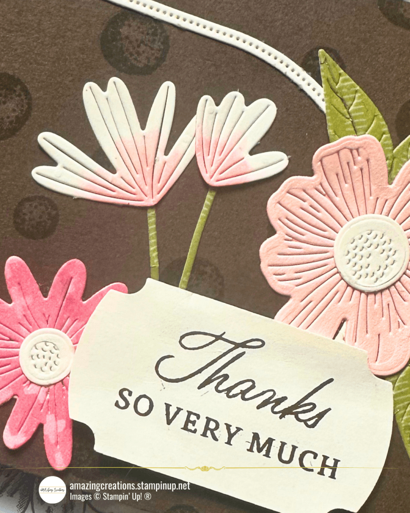 I die cut the smaller pink flower from the Strawberry Slush, Cross pattern in the Florals in Bloom DSP and the leaves from the Old Olive striped pattern from the Floral Impressions DSP. The framed the floral arrangement was adhered to the stitched oval from the Impressions Abloom Dies, then layered the “Thanks So Very Much” sentiment onto a punched shape made with the Labeled with Love Punch.