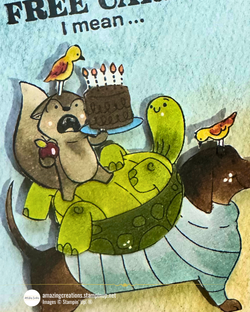 Next came the turtle, a few cheeky birds, and of course, the cake—all from the Turtle-y Awesome stamp set. Topping it off is a cake-wielding squirrel from Resourceful Rusty, looking like he’s ready to crash the party!