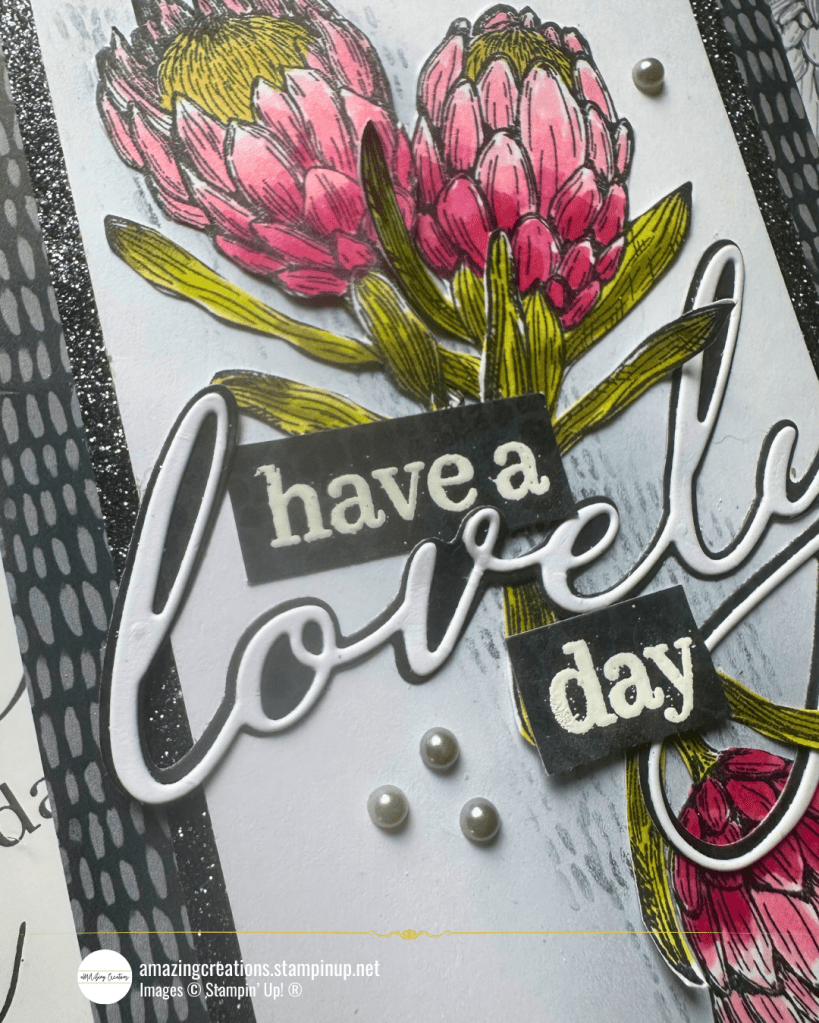 For this card I stamped the proteas onto white daisy cardstock & coloured them in with Stampin’ Blends, Darling Duckling for the yellow centres, a mix of Flirty Flamingo & Strawberry Slush for the pinks & various greens.
