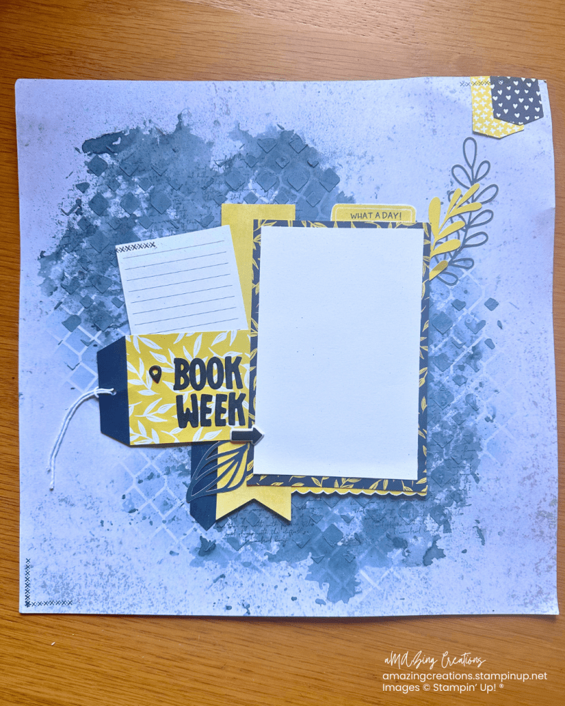 I added more layers & texture with the Elements of Text Stamp Set, which also lended well to the Book Week theme of this Scrapbook layout. I stamped with the same Secret Sea Ink & it can be seen due to the different application of the ink.