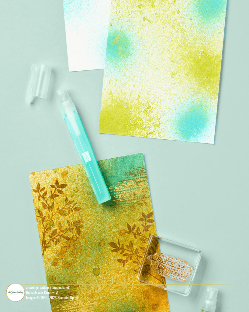 Layering a crisp stamp over that soft, mottled spritz is what gives these cards their incredible depth.