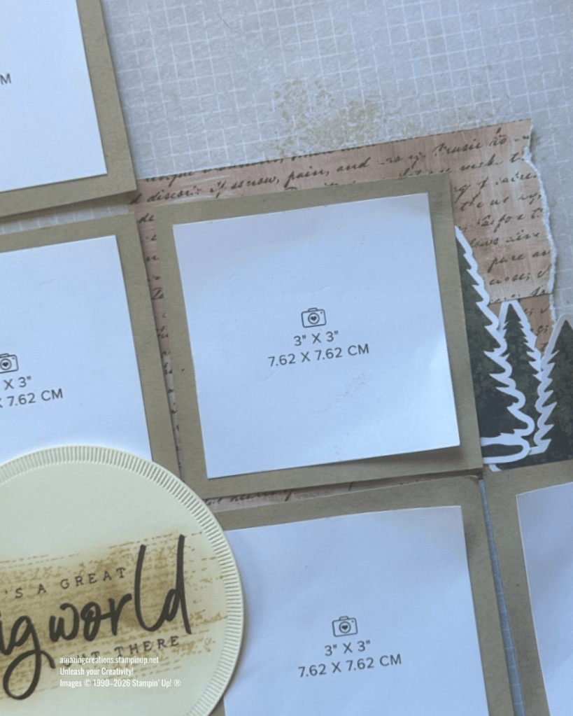 I converted my squares into five 3″ x 3″ photo spaces and uses papers, stickers & die cuts from the Exploring Nature Scrapbooking Workshop Kit and Brushed with Beauty Designer Series Paper which has gorgeous elements including white magnolias along with the evergreen trees, and travel-themed embellishments from the Exploring Nature. Perfect for showcasing your adventure and travel memories!