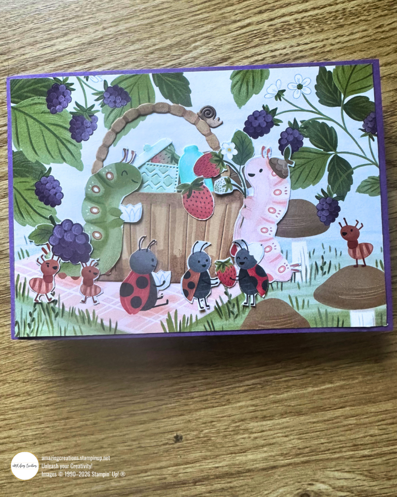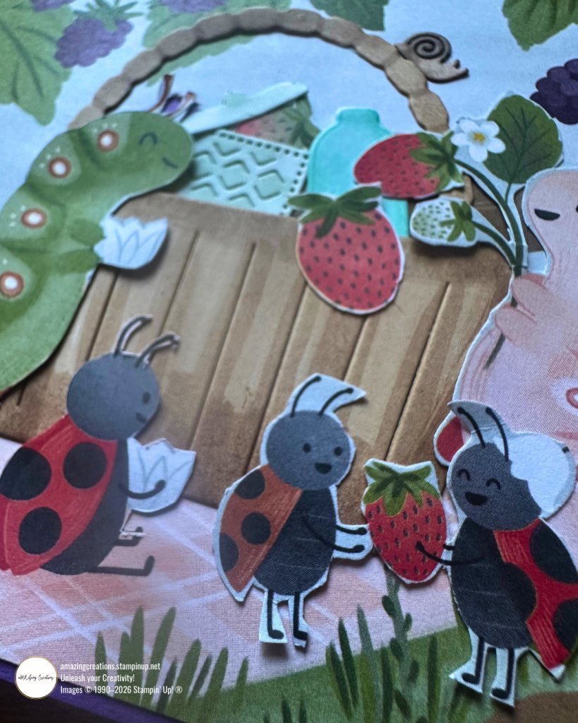 Who says bugs aren’t invited to the picnic? I took a scene from the Cute as a Bug DSP and decided it needed a few more guests. By adding fussy-cut critters and a custom basket using the Easter Basket Dies, I turned a simple background into a full-blown summer feast. Don’t you just love those tiny On Display jars tucked inside?