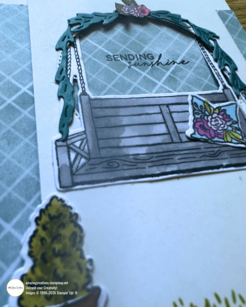 The Gliding Garden Swing itself is the star, but the accessories really tell the story. I used the long leafy vine die to frame the top of my circle cutout, which softens the geometric shape. For a cohesive look, I made sure my coloring on the potted tree and the floral cushion shared the same earthy tones. Stamping “Sending Sunshine” directly onto the background paper inside the circle keeps the sentiment from cluttering the beautifully colored swing. It’s a simple layout, but the layering of the die-cut “window” over the patterns gives it a professional, high-end finish.