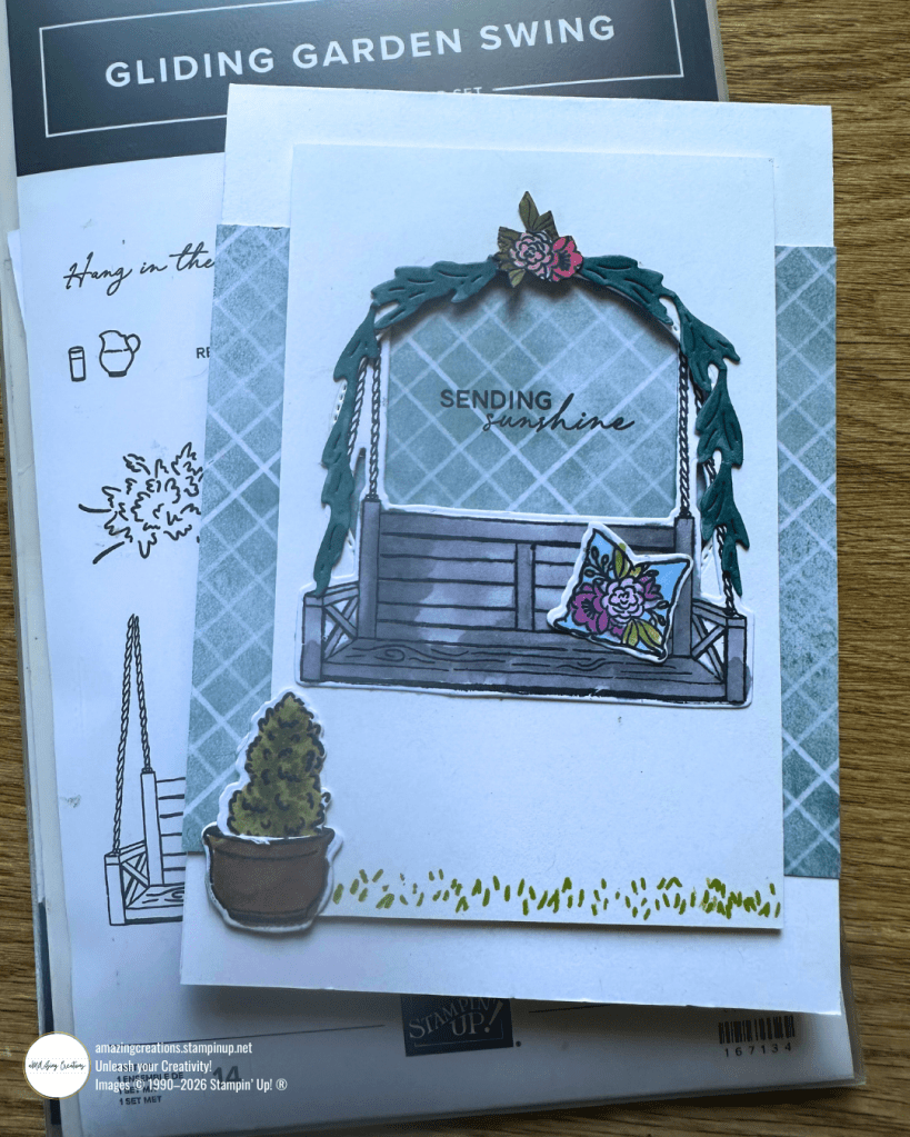 Step into a secret garden with this latest creation. Using the Gliding Garden Swing Bundle, I’ve designed a card that feels like a quiet moment outdoors. From the stamped grass to the leafy vine arch, every detail is designed to bring a smile to the recipient.